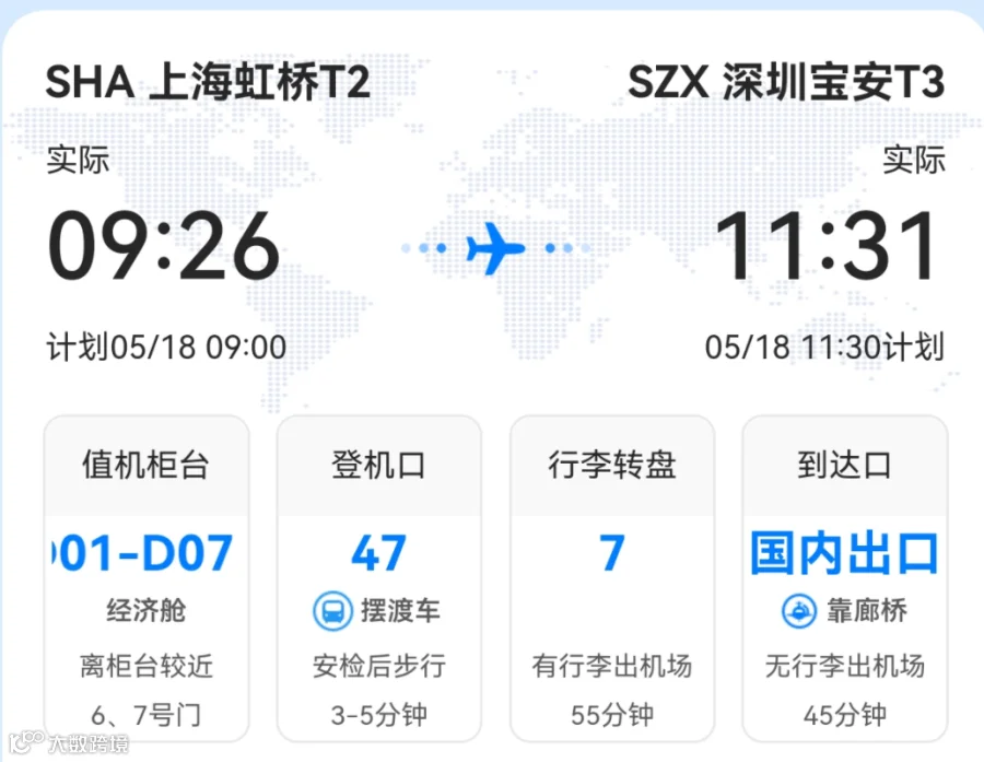 回程航班号MU5360,21:30从深圳起飞,23:55抵达上海虹桥。