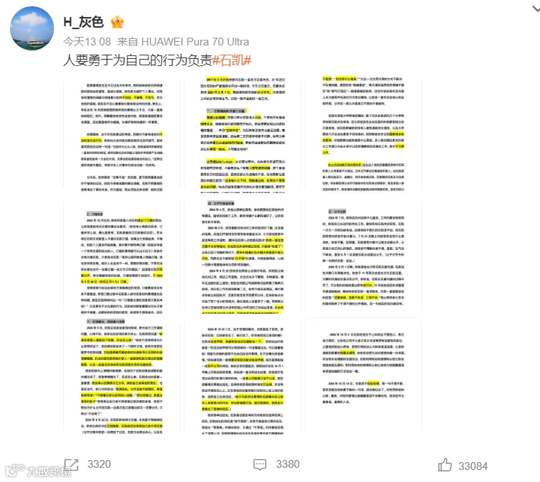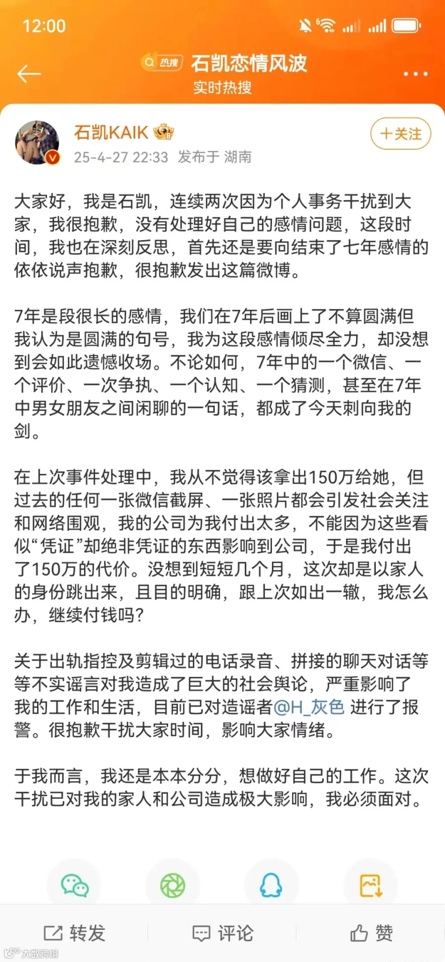 4月23日,自称当事人姐姐的微博用户@H_灰色发布长文,披露歌手石凯与化名“依依”的女性维持了七年(2017年5月-2024年)的情感纠葛。