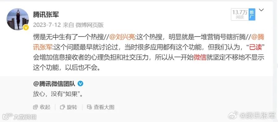 随后,腾讯公司公关总监张军发声:微信坚定不移地不提供该功能。“其实,这不是一个新话题。我记得2023年7月就有过一个类似的热搜,当时也做过相关的回复:‘已读’会增加信息接收者的心理负担和社交压力,所以从一开始微信就坚定不移地不提供这个功能,以后也不会。”