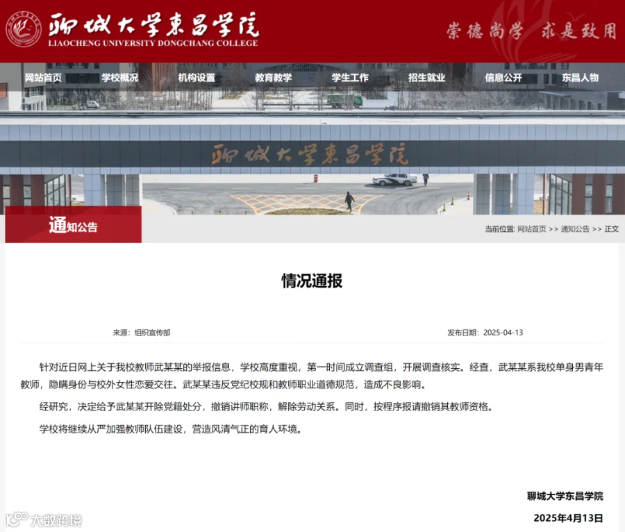 据大皖新闻此前报道,4月11日,网曝聊城大学东昌学院经济系一教师武某某被举报使用假身份,与多名女学生恋爱、发生关系。