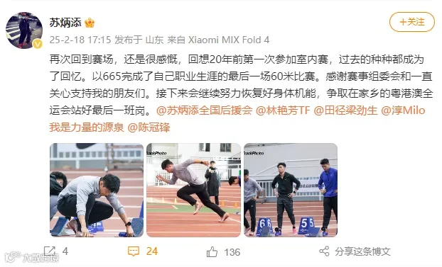 赛后,苏炳添发文表示:“再次回到赛场,还是很感慨,回想20年前第一次参加室内赛,过去的种种都成为了回忆。以6秒65完成了自己职业生涯的最后一场60米比赛。感谢赛事组委会和一直关心支持我的朋友们。接下来会继续努力恢复好身体机能,争取在家乡的粤港澳全运会站好最后一班岗。”