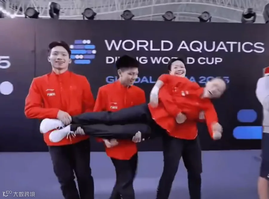 因为是四人出场的集体项目,所以赛前有一个简单的出场仪式。中国队的出场仪式很有特色,是由陈艺文、程子龙、王宗源一起抬着陈芋汐入场的,现场观众、其他队伍运动员看到这一幕,纷纷鼓掌露出了笑容。这一个举动也是有策划的,因为这四位运动员当中,陈芋汐的体重最轻,所以大家首选就是抬着她入场。而这个入场阵容中,有三位选手都获得过奥运会金牌,中国跳水队展现出了独一无二的强大和自信。