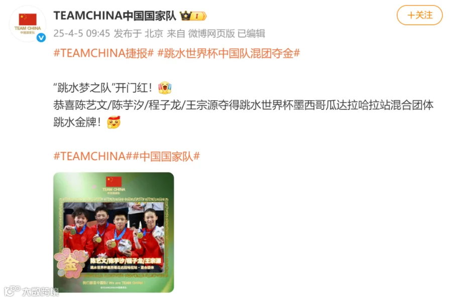 北京时间4月5日,跳水世界杯墨西哥瓜达拉哈拉站混合团体决赛,由陈艺文、陈芋汐、程子龙、王宗源组成的中国队展现强劲实力,以489.10分夺得冠军,领先亚军72.65分。意大利队获得银牌,德国队摘铜。