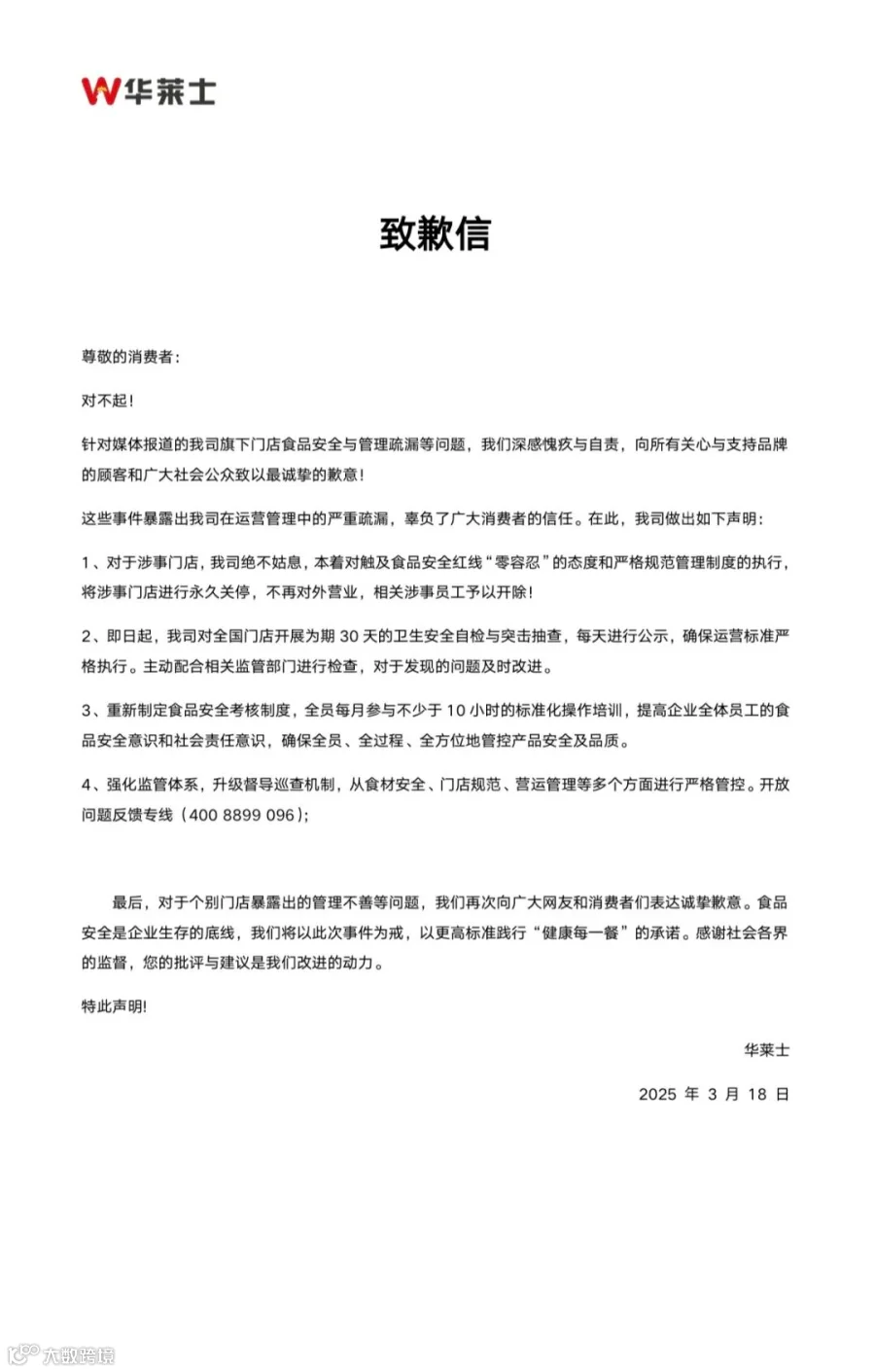 华莱士表示,这些事件暴露出华莱士在运营管理中的严重疏漏,将对涉事门店进行永久关停,不再对外营业,相关涉事员工予以开除。全国门店开展30天的卫生安全自检与突击抽查。