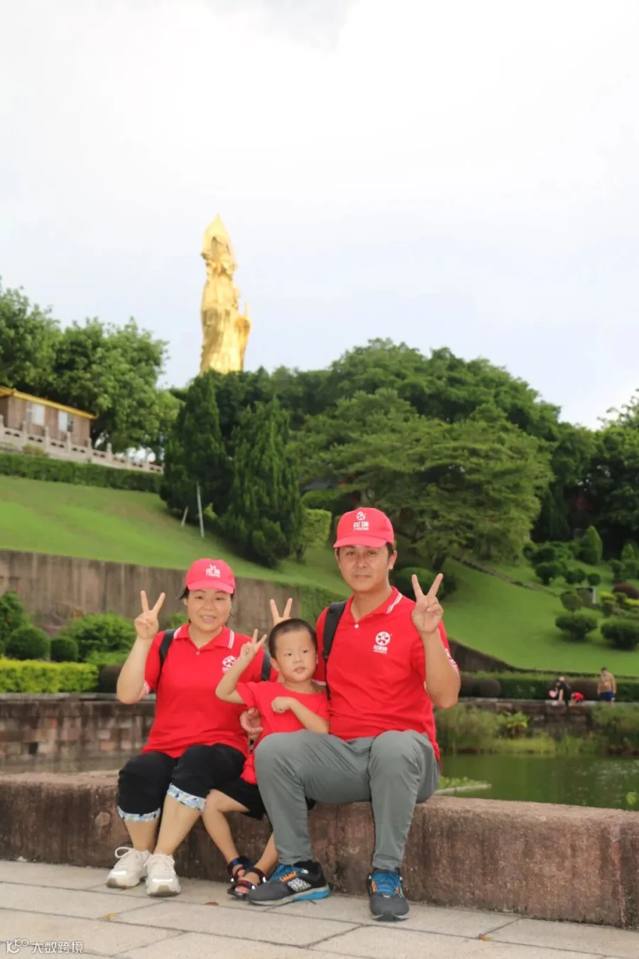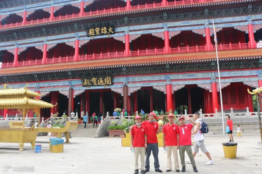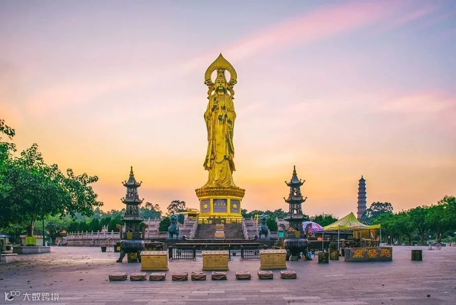 莲花山原名"石狮头",是古代石矿场,因采石后留下来的石头似出水芙蓉(莲花)状而得名,步入观音圣境,笔直宽广的朝圣大道,从莲花塔下往东一直通到面向狮子洋的山腰,两旁树木排列整齐,自成阵势。尽头是一个青石铺砌的广场,广场中央,慈颜善目、金光耀眼的望海观音宝像屹立在两层莲花宝座上,像高40.88米,用120吨青铜铸成,外贴180两纯金,是目前箔金观音铜立像的世界之最!如此壮观盛景,大伙纷纷合影留念~