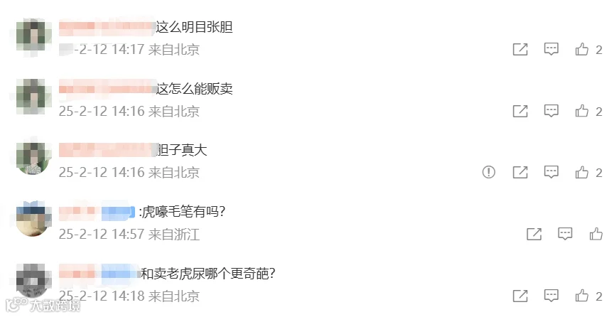 据媒体报道,今年1月份,四川雅安碧峰峡野生动物园对外出售虎尿,50元一瓶。