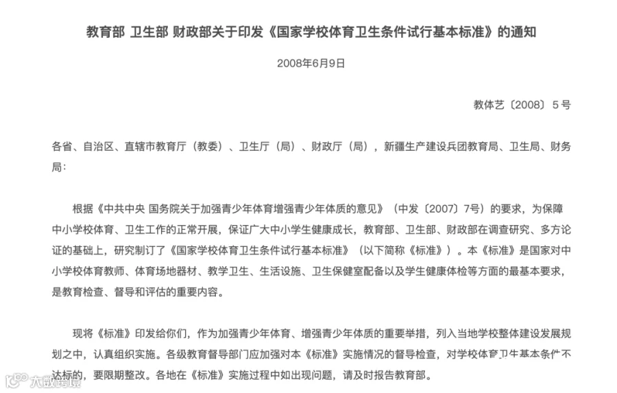 2008年该校开始改造宿舍时,同年6月9日由教育部、卫生部、财政部联合印发的《国家学校体育卫生条件试行基本标准》中,明文规定“学生宿舍的居室,人均使用面积不应低于3.0平方米”。文中还写明,《标准》是中小学校办学应达到的最基本标准,是教育检查、督导和评估的重要内容。尚未达到本《标准》的,应积极创造条件,使其尽快达到标准要求。各地在新建和改扩建中小学校时,应当按照本《标准》进行建设和配备。