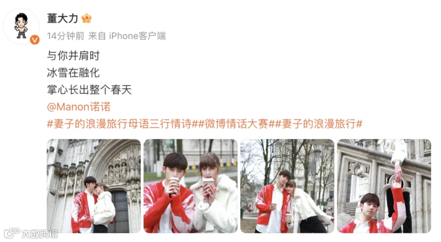 13时14分,前击剑运动员董力和@Manon诺诺 晒合照官宣参加节目《妻子的浪漫旅行》,间接官宣结婚喜讯。