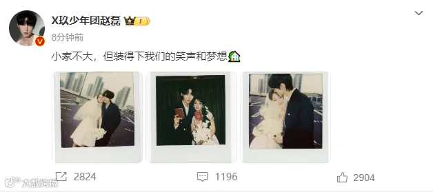 今日早些时候,X玖少年团成员赵磊也在社交平台上官宣喜讯。赵磊晒出3张照片,并表示:“小家不大,但装得下我们的笑声和梦想。”