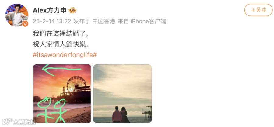 董力官宣结婚后,中国香港男演员方力申也在社交平台晒照官宣结婚,并配文:“我们在这里结婚了,祝大家情人节快乐。”