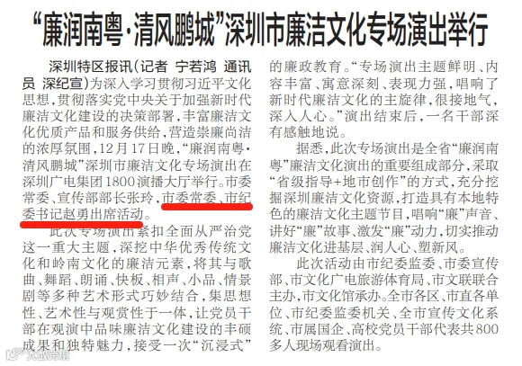 特区报消息,12月17日晚,“廉润南粤·清风鹏城”深圳市廉洁文化专场演出在深圳广电集团1800演播大厅举行。市委常委、宣传部部长张玲,