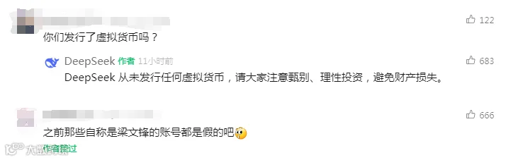 在DeepSeek微信评论区,有网友问及DeepSeek是否发行了虚拟货币,DeepSeek方面称:“DeepSeek从未发行任何虚拟货币,请大家注意甄别、理性投资,避免财产损失。”
