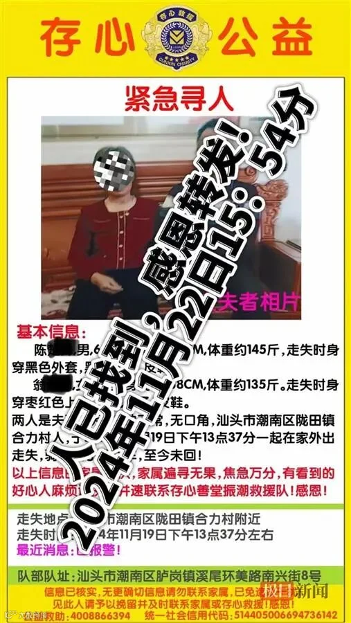 当地一救援队近日发布寻人信息称,汕头市潮南区陇田镇合力村63岁男子陈某某、64岁女子翁某某,于11月19日13时37分从家中外出后失联。两人为夫妻关系,精神正常,无口角。两人失踪前骑着摩托车,失联后家属已报警。