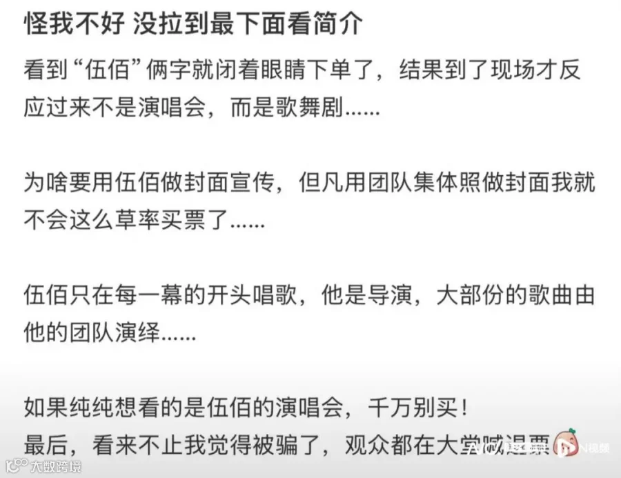 有要求退票的观众在社交平台表示,官方宣传物料具有误导性,导致自己误以为该场演出是伍佰个人演唱会,“为什么要用伍佰做封面宣传?但凡用团队集体照做封面,我就不会这么草率买票了。”