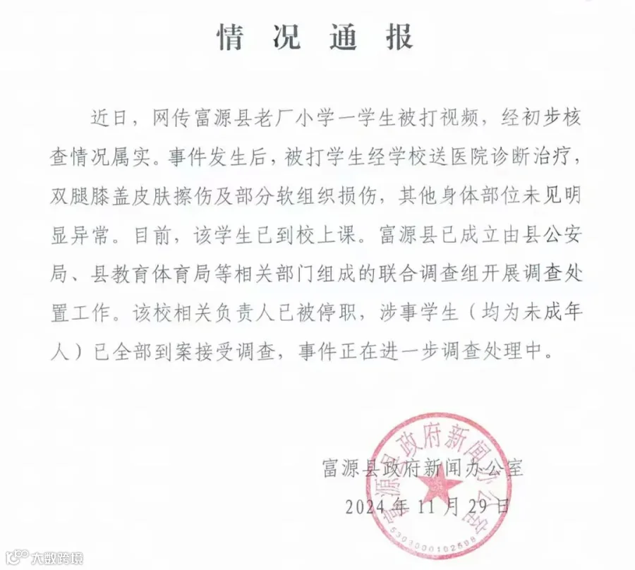 通报信息显示,事件发生后,被打学生经学校送医院诊断治疗,双腿膝盖皮肤擦伤及部分软组织损伤,其他身体部位未见明显异常。目前,该学生已到校上课。富源县已成立由县公安局、县教育体育局等相关部门组成的联合调查组开展调查处置工作。该校相关负责人已被停职,涉事学生(均为未成年人)已全部到案接受调查,事件正在进一步调查处理中。
