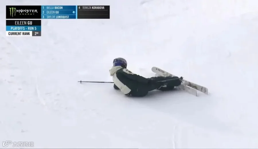 女子双板街区赛决赛共四人参加,谷爱凌第三位出场,但在比赛过程中接连摔倒三次,最终位列第四名。