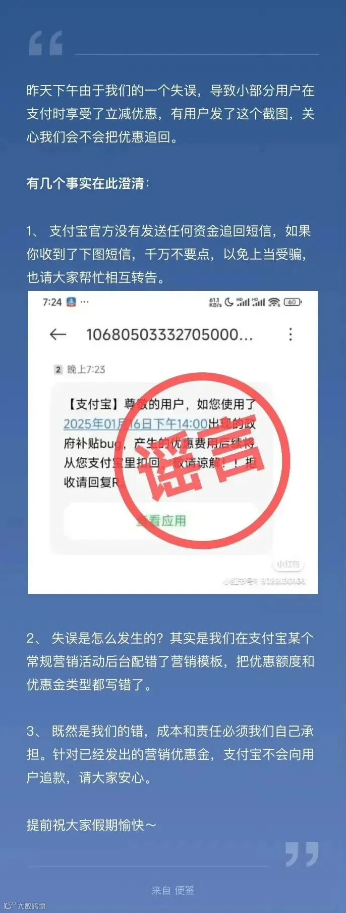 1月17日凌晨,支付宝官方微博发文称:昨日下午由于我们的一个失误,导致小部分用户在支付时享受了立减优惠,有用户发了这个截图,关心我们会不会把优惠追回。有几个事实在此澄清: