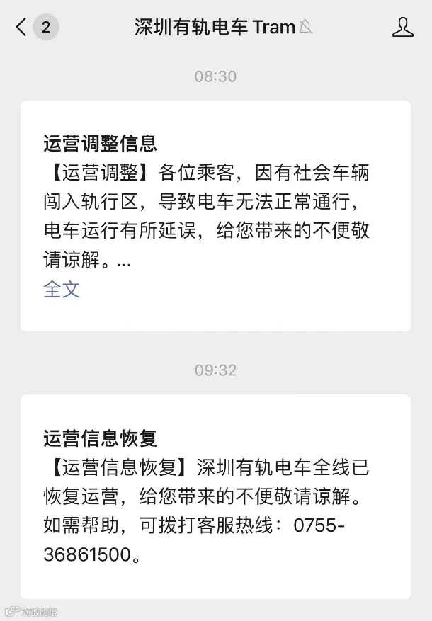 【09:31运营信息恢复】深圳有轨电车全线已恢复运营,给您带来的不便敬请谅解。如需帮助,可拨打客服热线:0755-36861500。