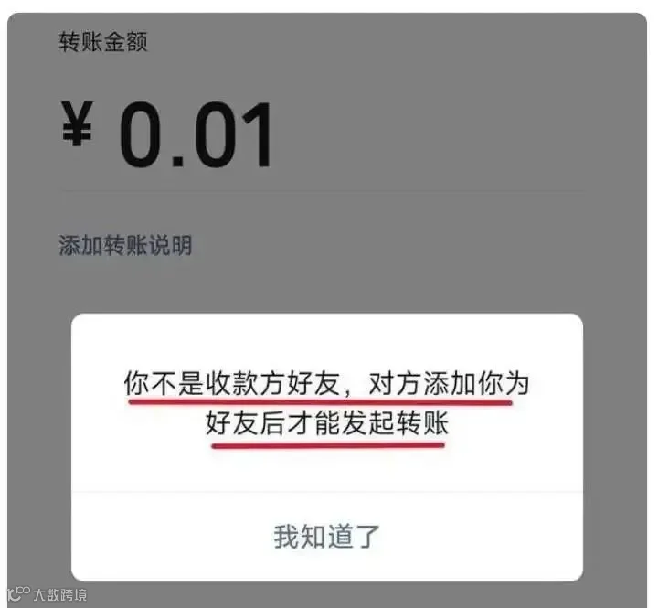 方好友,对方添加你为好友后才能发起转账”这样的提示,那很明显已经被对方给删除了。