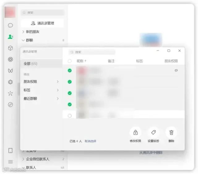 12月,微信PC版更新功能,进一步完善了好友管理功能。点击左侧「通讯录」按钮,进入通讯录页面后,再点击顶部的「通讯录管理」,在弹出的窗口中,可集中编辑好友备注名、标签、好友权限,更可批量删除好友。