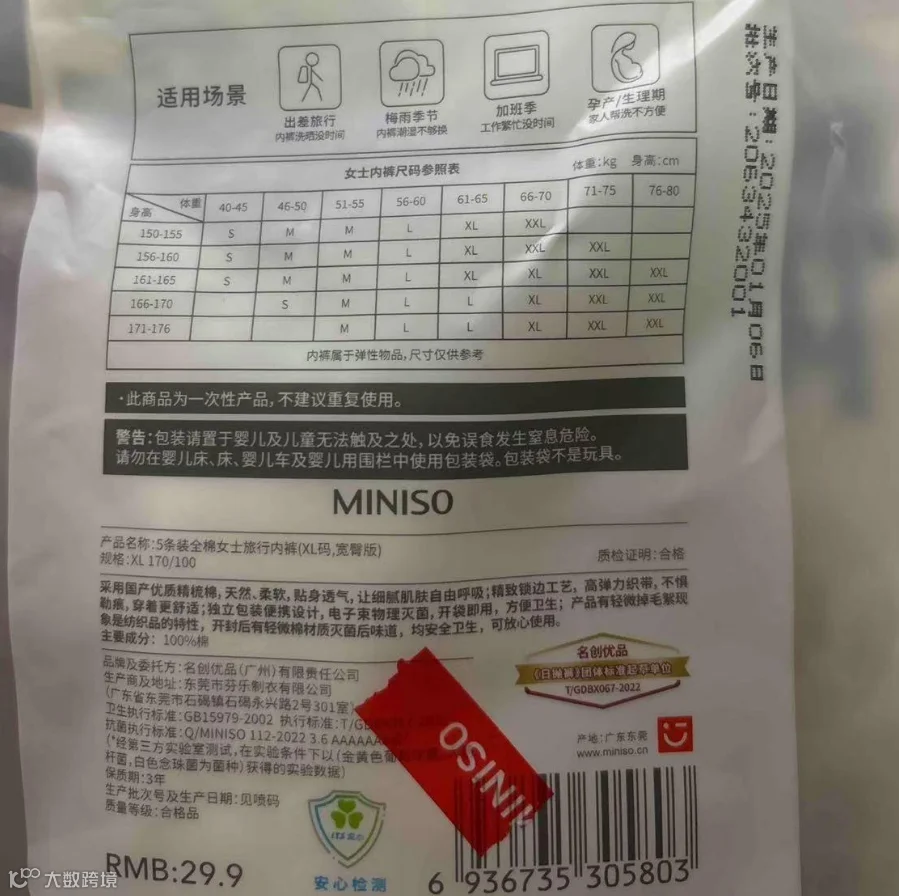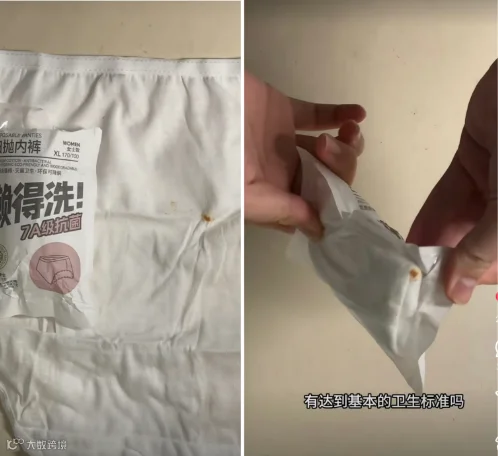 记者在消费者所发投诉帖上看到,未拆开包装的一次性内裤表面有明显的黄色污渍。根据其提供的产品包装,该产品生产日期为2025年1月6日,批次号为2063432001,保质期为3年,产品品牌及委托方为名创优品(广州)有限责任公司,生产商为东莞市芬乐制衣有限公司。