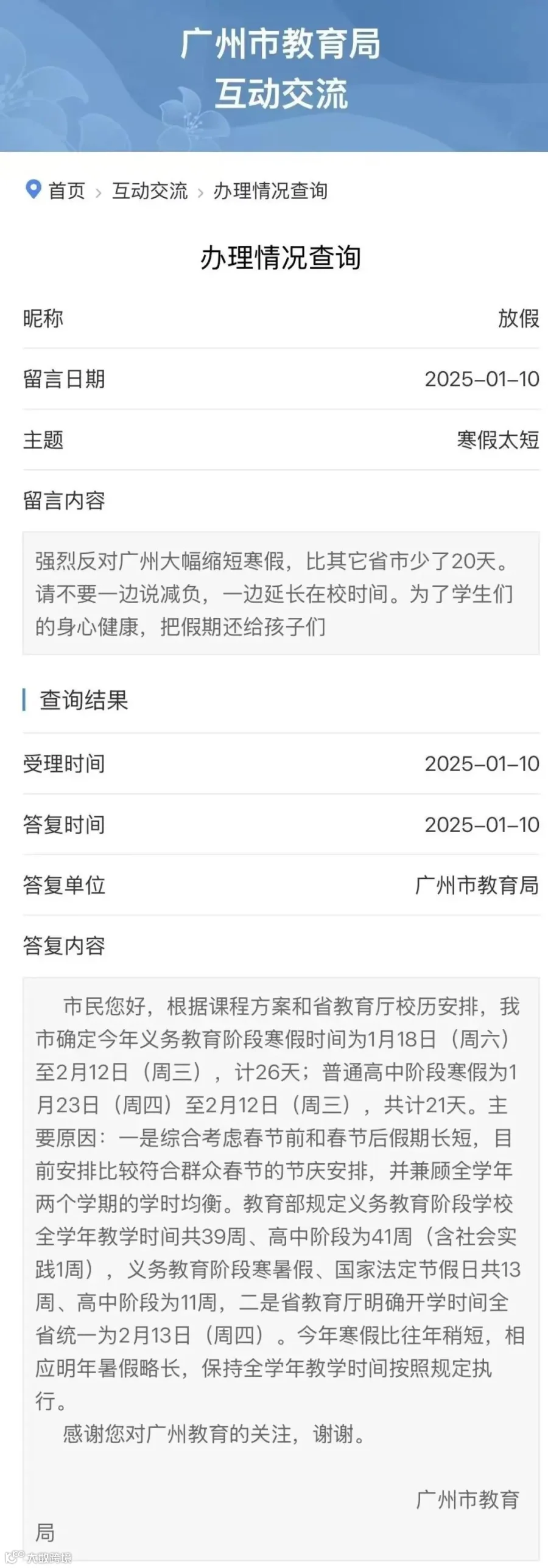记者了解到,去年广州市义务教育阶段寒假时间为1月22日至2月19日,共计29天;普通高中阶段寒假为1月29日至2月19日,共计22天。与以往相比,今年寒假假期时长变短了。