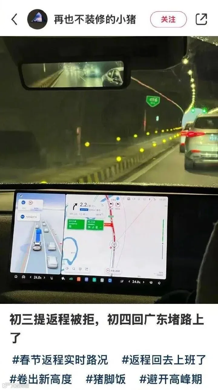 2月1日下午4时21分,有网友发帖称,本想大年初三提前返程未成行,大年初四回广东,结果堵在路上。图片显示,前方车辆亮着红色尾灯,驾驶室中控屏上,导航软件上很长一段线路已变红色,提示道路拥堵。导航信息显示,车子正行进在G0422高速路(武深高速)上,距炎陵服务区还有40公里左右。公开信息显示,炎陵服务区位于湖南省株洲市炎陵县境内。记者私信该网友求证帖子真伪,对方回复,这确实是昨天其在春运返程时道路的堵车情况。