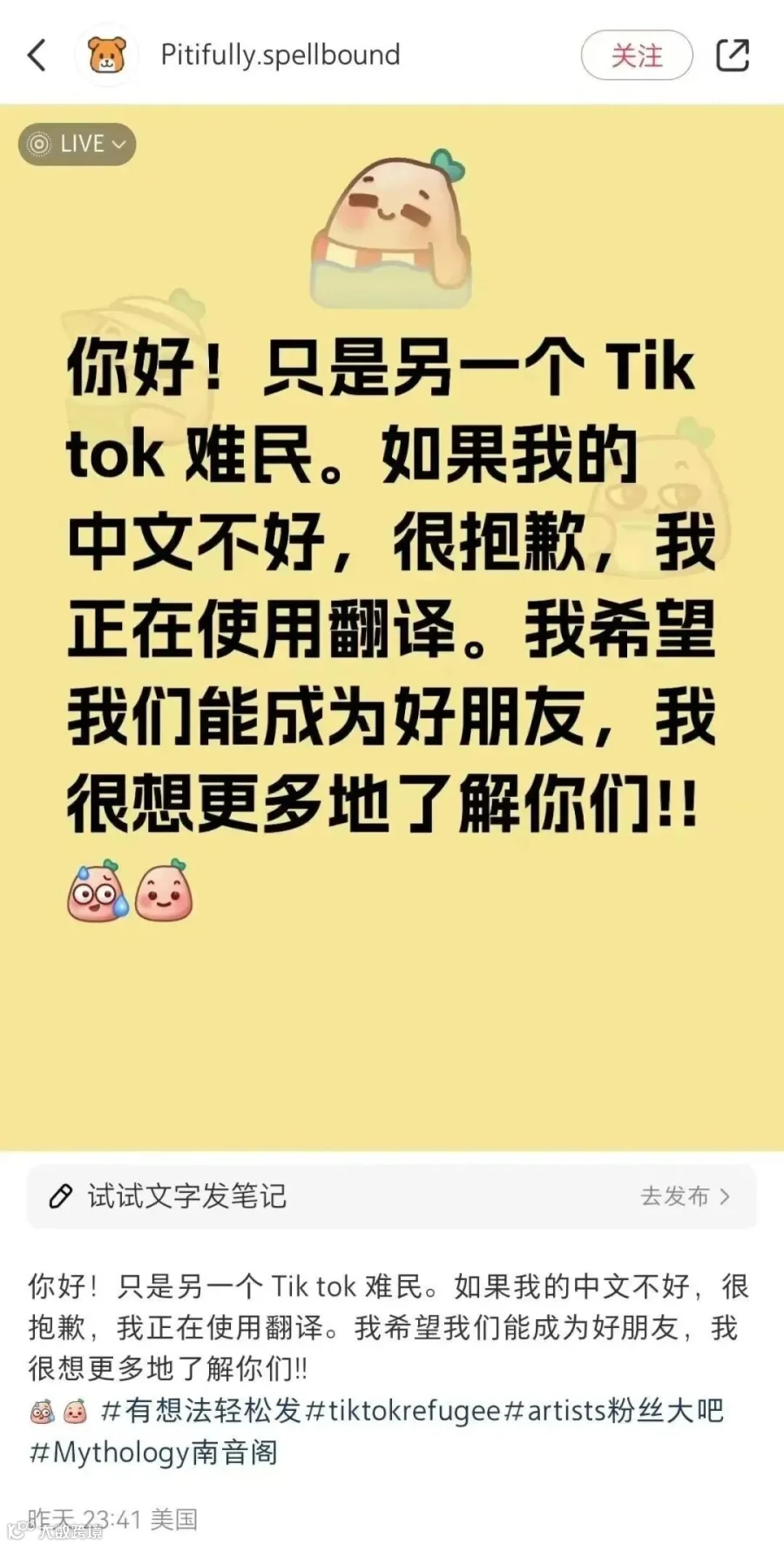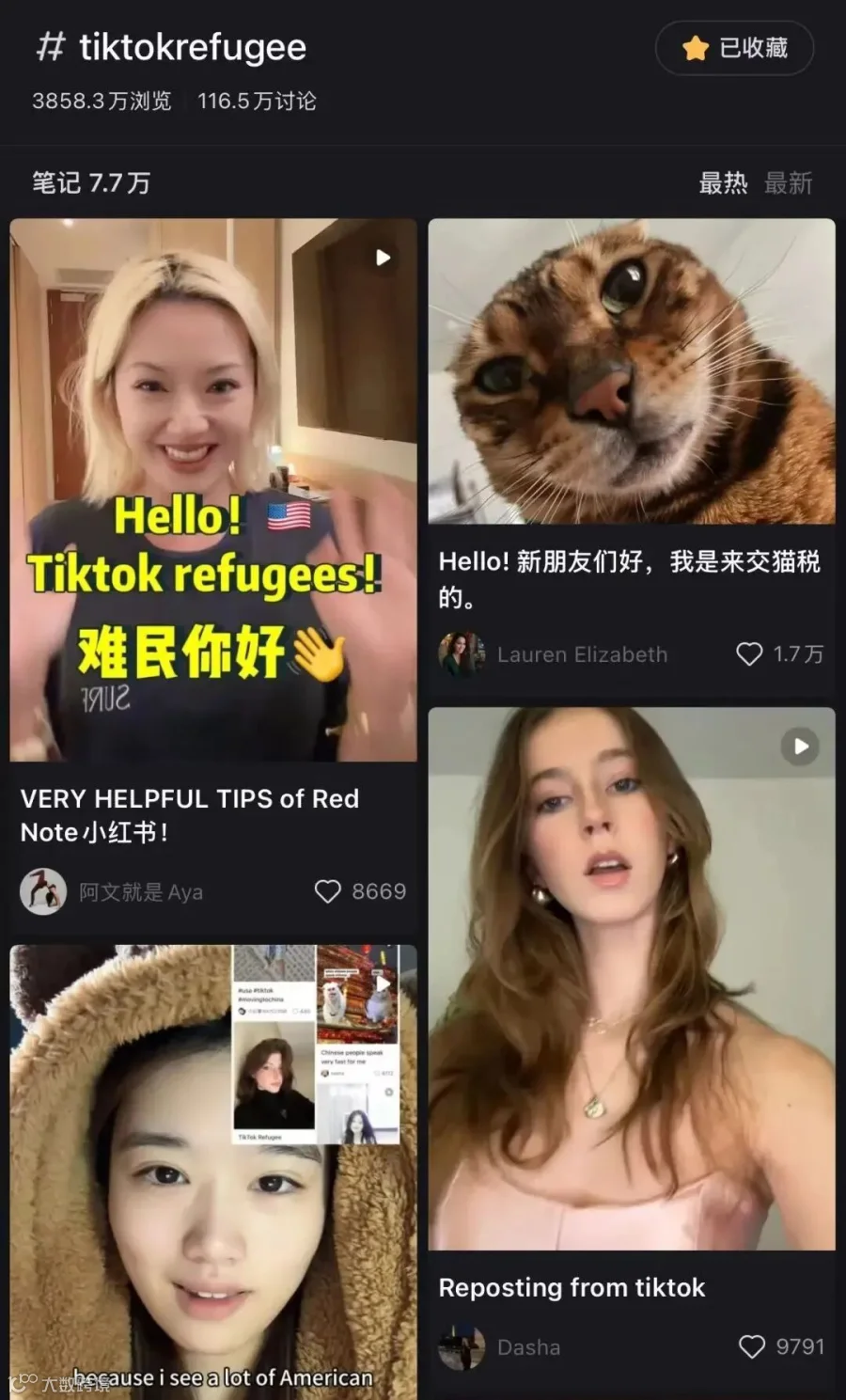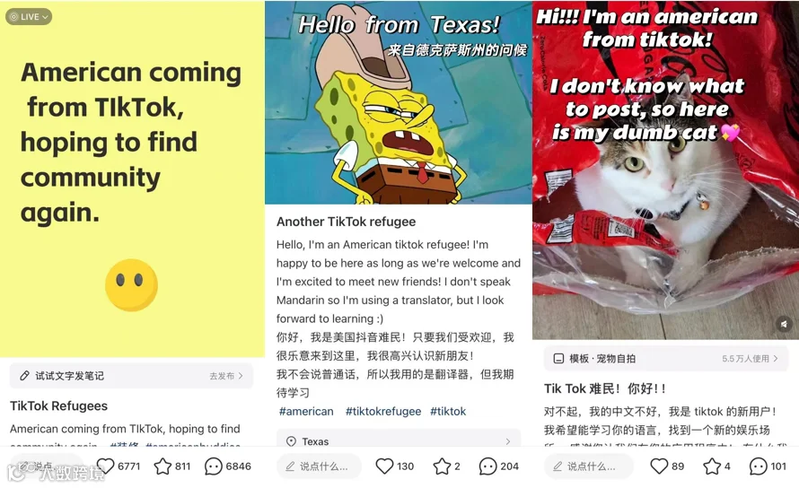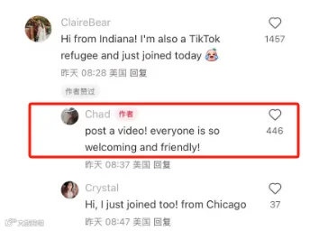 这些帖主通常都自称“TikTok难民”且帖文IP(发帖地点)来自美国