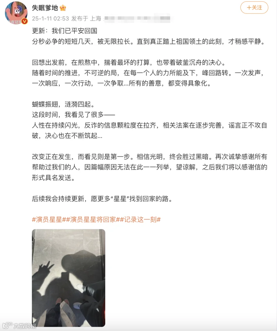 1月11日凌晨,王星发文报平安:我是中国公民王星,此时此刻,我已经回到祖国的怀抱。这个让我感到温暖、踏实、自由的怀抱。在异国他乡,是祖国的强大给了我勇气和希望。每一位帮助我的朋友们,未曾谋面的网友们。我想说,我只是一个特别普通的人,会害怕,会忧虑……可就在我快要彻底放弃的时候,是你们给了我希望,让我再选择相信一点,再坚持一下,帮助我回到我爱的祖国,爱我的人身边。我由衷地谢谢你们!也非常感谢中国政府,中国驻泰、驻缅大使馆,中泰警方等各个执法部门,感谢你们一直在我们背后努力着!最后感谢我的女朋友“love can fight everything”。