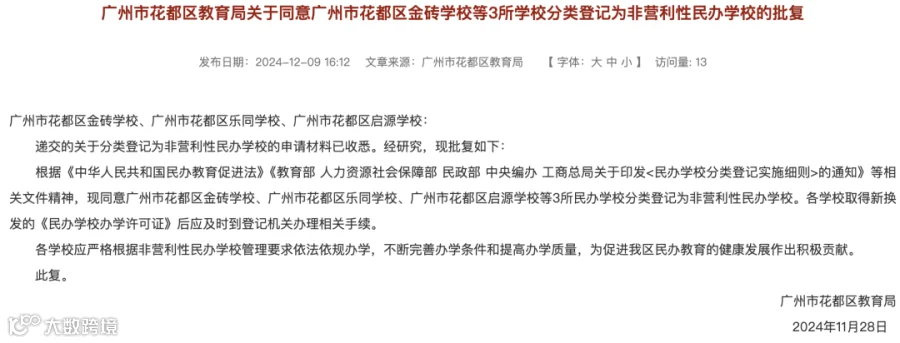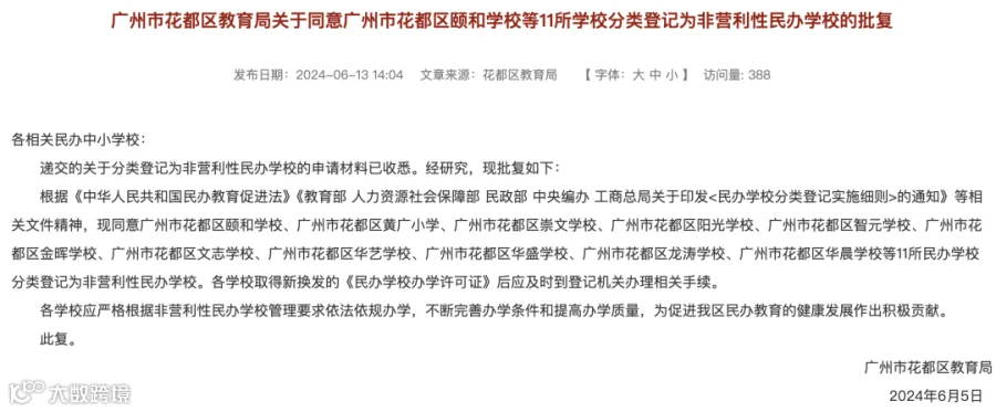 今年6月,花都区教育局曾发布关于同意广州市花都区颐和学校等11所学校分类登记为非营利性民办学校的批复。