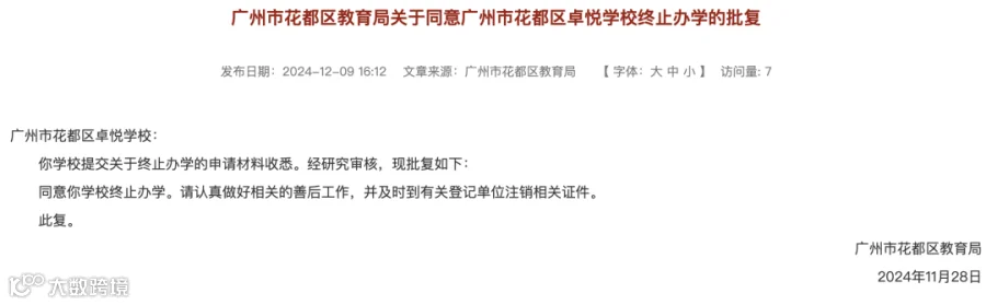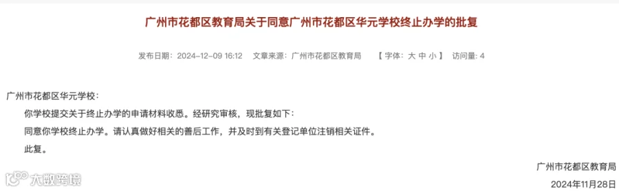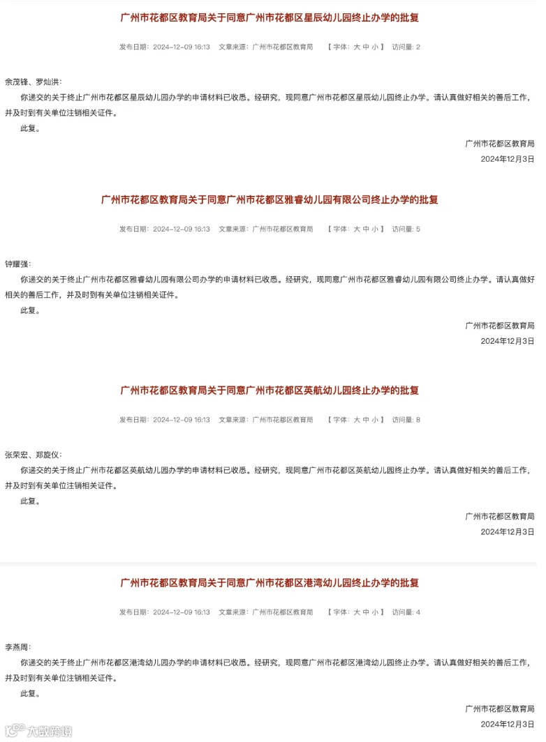 此外,花都区教育局发布4所幼儿园终止办学的批复。