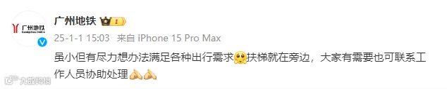 昨天下午,@广州地铁 也发文回应:“虽小但有尽力想办法满足各种出行需求。扶梯就在旁边,大家有需要也可联系工作人员协助处理。”