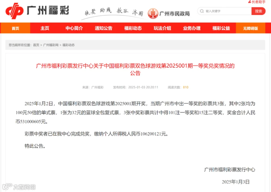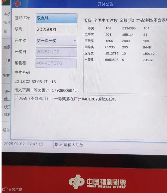 2025年1月2日,中国福利彩票双色球游戏第2025001期开奖,当期广州市中出一等奖的彩票共3张,其中2张均为100元50倍的单式票,1张为32元的蓝球全包复式票,3张中奖彩票共计中得101注一等奖和15注二等奖,奖金合计人民币531000605元。