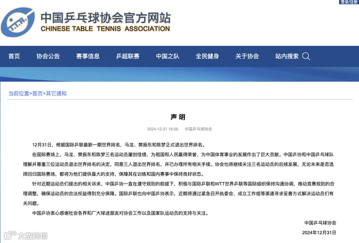 据悉,在圆满完成巴黎奥运会参赛任务后,中国乒乓球队和中国乒协一直与主力队员保持沟通,就他们的身心调整、状态恢复、训练、参赛、个人事务统筹安排等工作进行交流。马龙、樊振东、陈梦向国家队提出了退出世界排名的申请,经中国乒乓球队、中国乒协和国际乒联正式履行相关流程,现已完成全部手续。