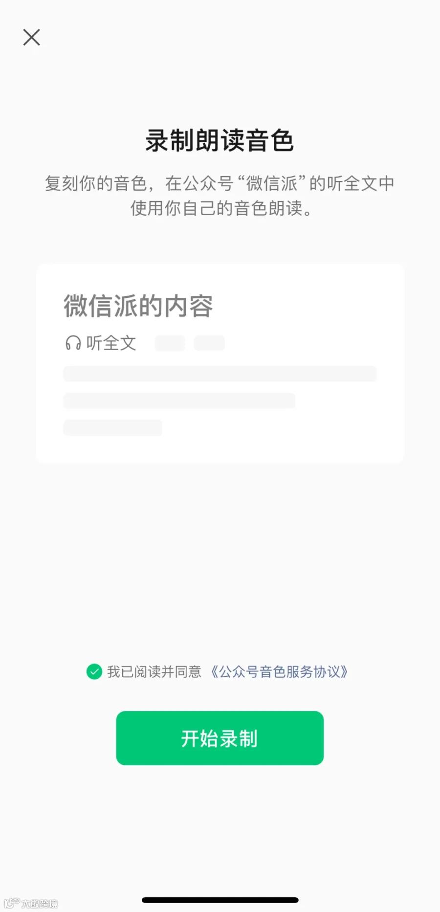 “发声”第一步,作者需要下载一个“订阅号助手”APP,点击“我-设置-朗读音色”,就可以录制例句,例句也会复刻你的语气和情感。录制完成并点击应用,即可在公众号里拥有自己的个性化语音。