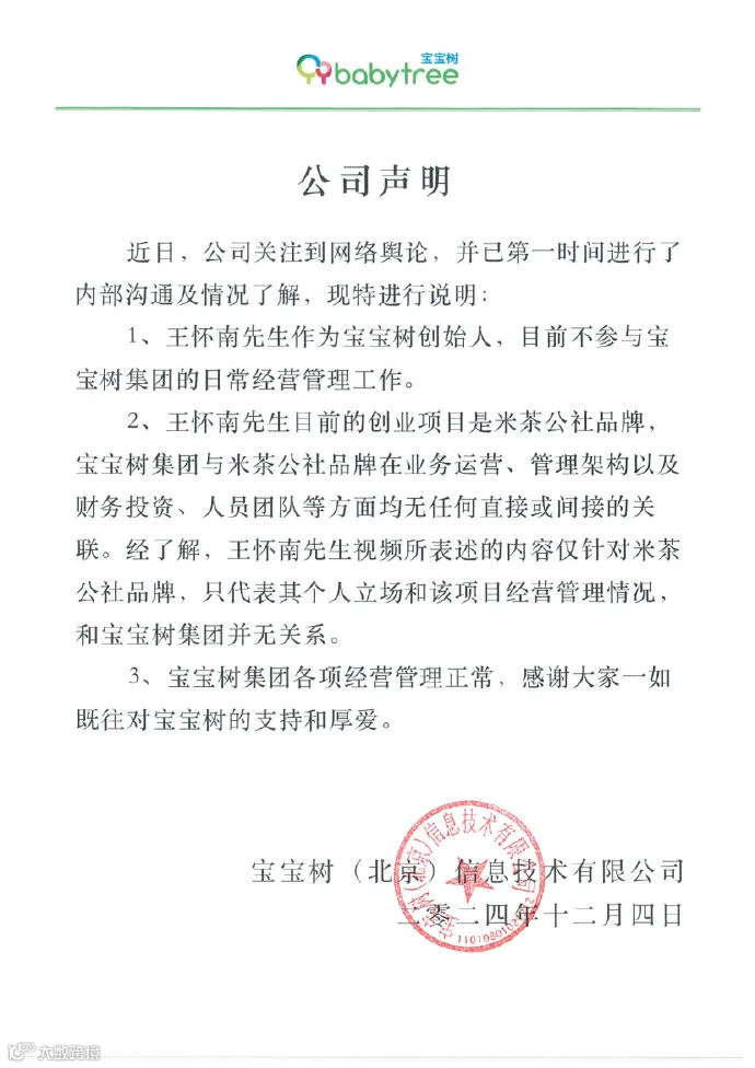 王怀南视频所表述的内容仅针对米茶公社品牌,只代表其个人立场和该项目经营管理情况,和宝宝树集团并无关系,