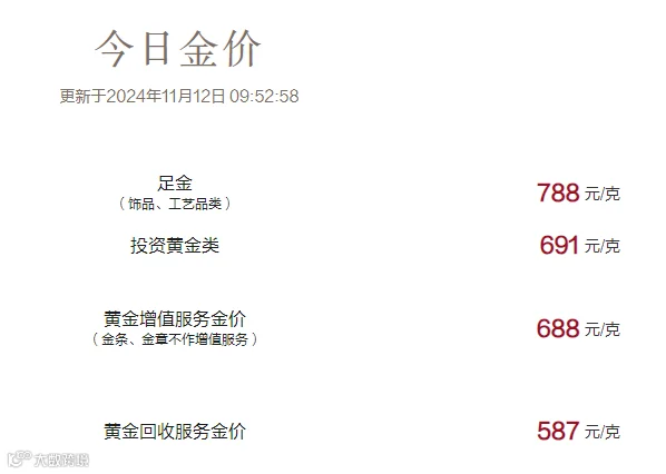 11月12日,国内黄金珠宝品牌金饰价格也应声跟跌。