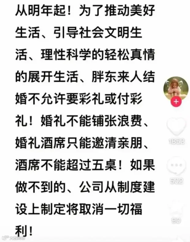 从明年起,为了推动美好生活、引导社会文明生活……胖东来人结婚不允许要彩礼或付彩礼!婚礼不能铺张浪费,婚礼酒席只能邀请亲朋,酒席不能超过五桌!如果做不到的,公司从制度建设上制定将取消一切福利!未来的胖东来人是不允许靠父母买房买车!完全有能力靠自己主宰创造和享受美好人生。