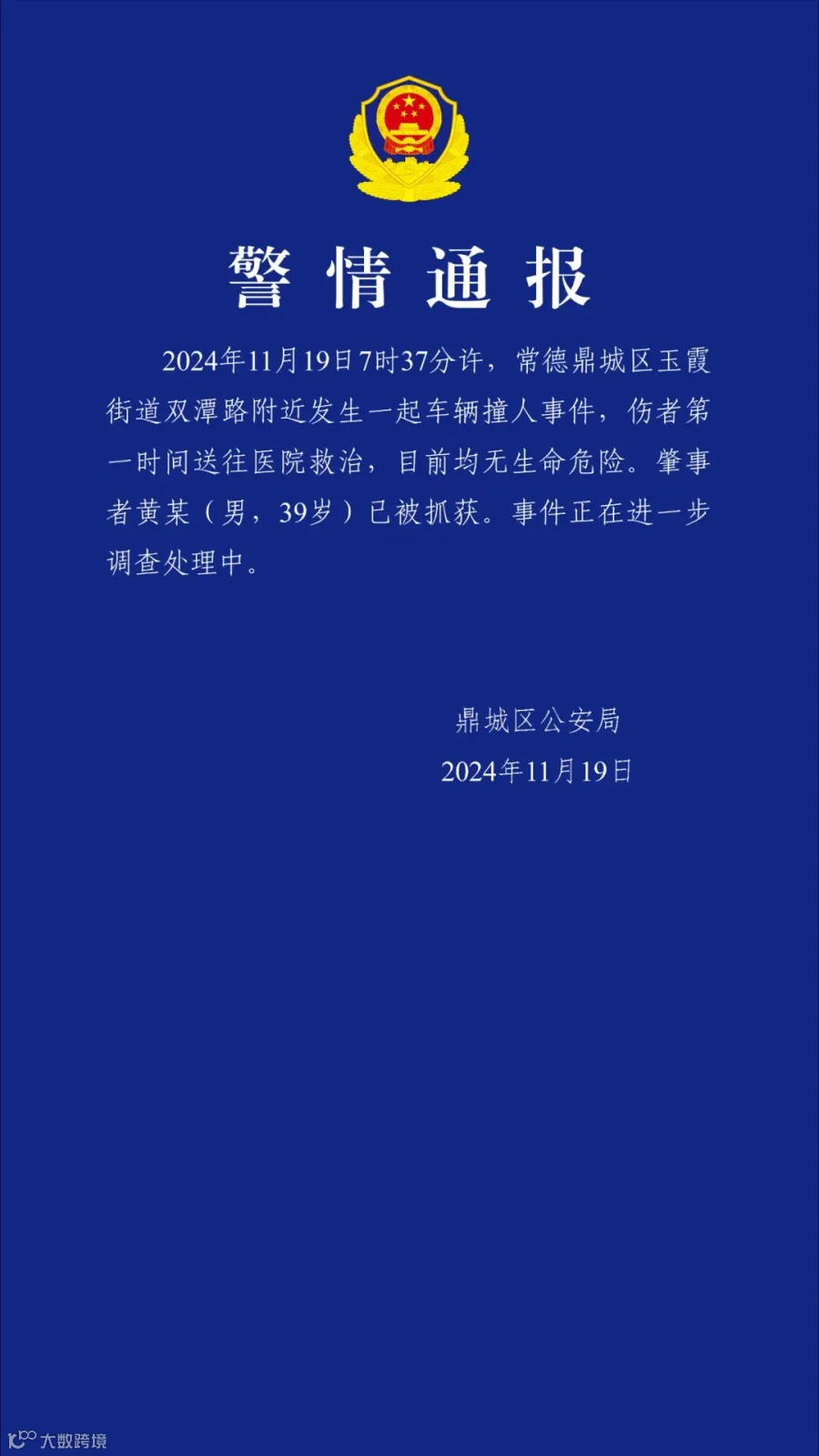 市鼎城区公安局发布警情通报:11月19日7时37分许,常德鼎城区玉霞街道双潭路附近发生一起车辆撞人事件,伤者第一