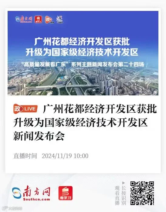 此前,国务院办公厅已于10月27日发布《关于广州花都经济开发区等4个省级开发区升级为国家级经济技术开发区的复函》,正式批准广州花都经济开发区升级为国家级经济技术开发区(以下简称“经开区”)。