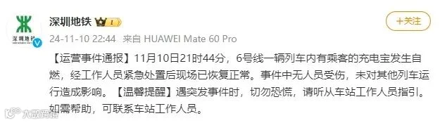 随后,深圳地铁官方微博发布通告称:6号线一乘客充电宝发生自燃,经工作人员紧急处置后,目前现场已恢复正常,无人员受伤,未对其他列车运行造成影响。
