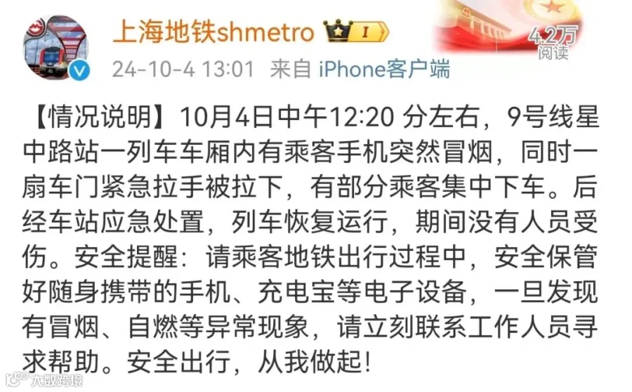此前,也有地铁发生过电子设备着火事件。据上海地铁消息,10月4日12:20左右,9号线星中路站一列车车厢内有乘客手机突然冒烟,同时一扇车门紧急拉手被拉下,有部分乘客集中下车。
