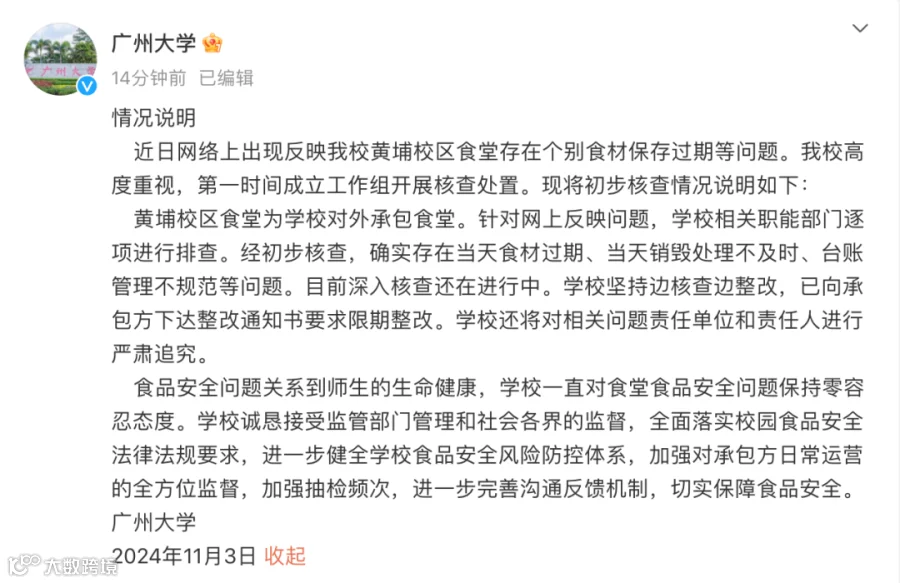 大学黄埔校区食堂存在个别食材保存过期等问题,广州大学发布情况说明称,
