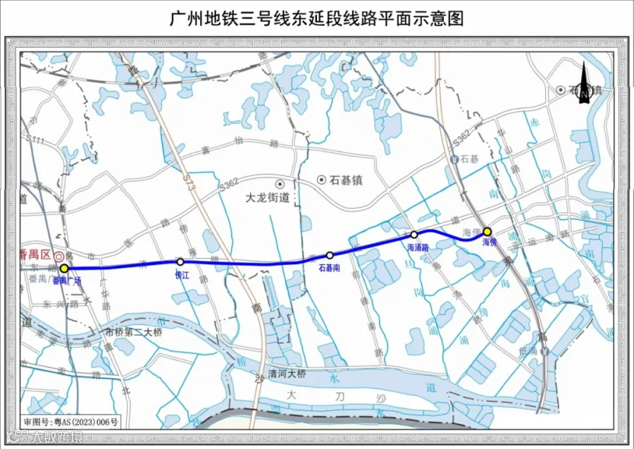 广州地铁三号线东延段西起番禺广场站,沿亚运大道向东延伸至海傍站与四号线换乘,是贯穿番禺区东西向的交通骨干。线路全长9.6公里,为全地下敷设,共设