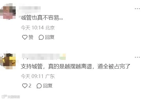 在视频下方评论区,网友的评论也呈现分化趋势,有网友认为应支持城管执法,无序的摆摊行为确实对现场交通秩序和附近居民的生活造成了影响,需要得到整治。