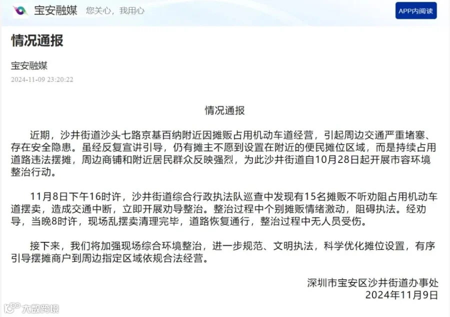 通告中提到,近期,沙井街道沙头七路京基百纳附近因摊贩占用机动车道经营,引起周边交通严重堵塞、存在安全隐患。周边商铺和附近居民群众反映强烈,为此