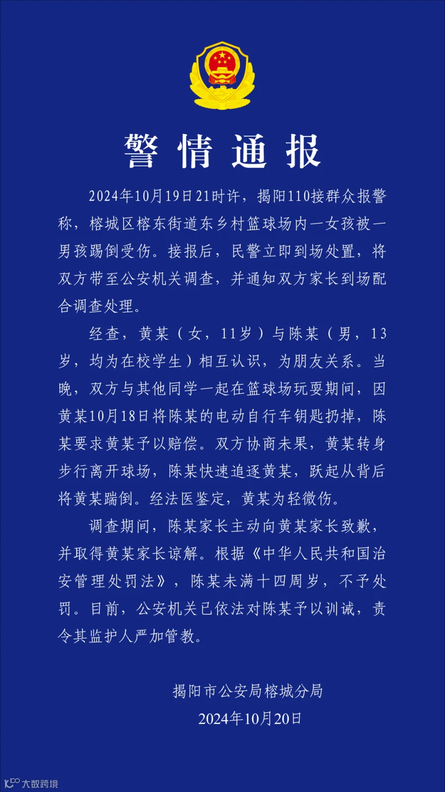 10月19日21时许,揭阳110接群众报警称,榕城区榕东街道东乡村篮球场内,一女孩被一男孩踢倒受伤。接报后,民警立即到场处置,将双方带至公安机关调查,并通知双方家长到场配合调查处理。