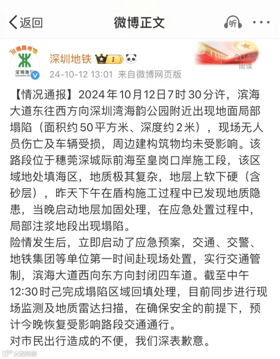 2024年10月12日7时30分许,滨海大道东往西方向深圳湾海韵公园附近出现地面局部塌陷(面积约50平方米、深度约2米),现场无人员伤亡及车辆受损,周边建构筑物均未受影响。该路段位于穗莞深城际前海至皇岗口岸施工段,该区域地处填海区,地质极其复杂,地层上软下硬(含砂层),昨天下午在盾构施工过程中已发现地质隐患,当晚启动地层加固处理,在应急处置过程中,局部注浆地段出现塌陷。