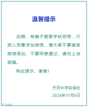 市天河中学今日(5日)下午发布官方提示称,近期有骗子假冒该校领导、行政人员通过微信向他人添加好友,请大家不要接受添加、不要同意通过,切勿上当受骗。