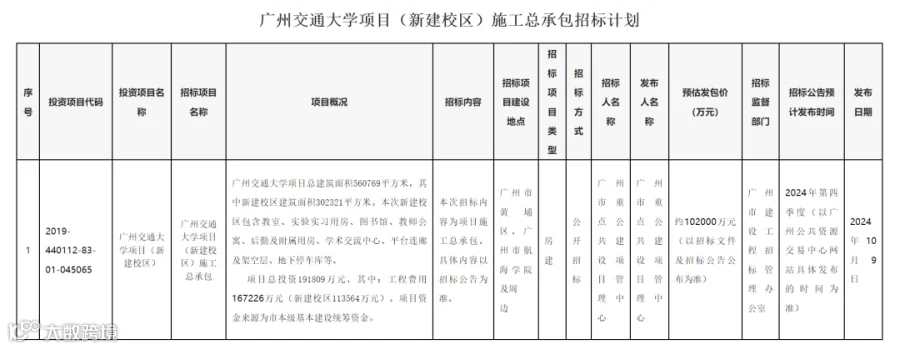 招标计划显示,广州交通大学项目总建筑面积560769平方米,其中新建校区建筑面积302321平方米。本次新建校区包含教室、实验实习用房、图书馆、教师公寓、后勤及附属用房、学术交流中心、平台连廊及架空层、地下停车库等。项目总投资191809万元,建设可容纳10000名学生和教职员工的综合性大学校园。